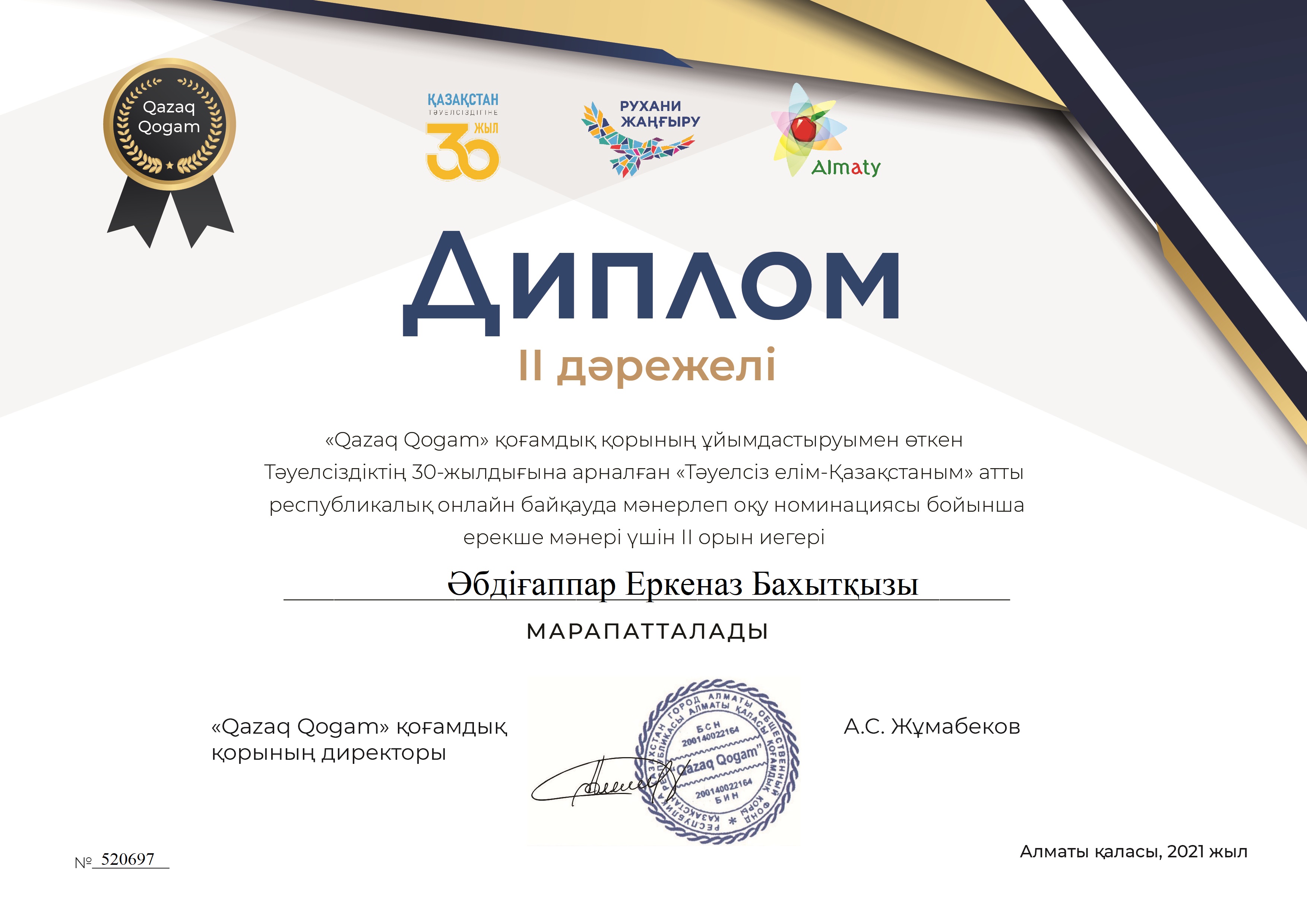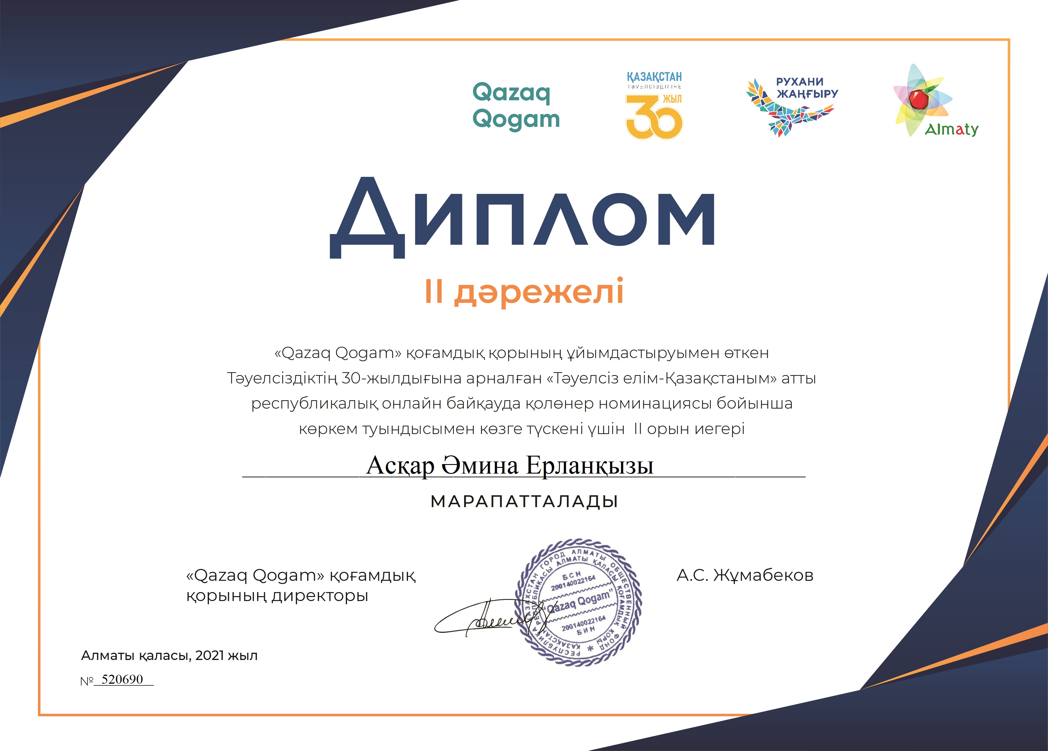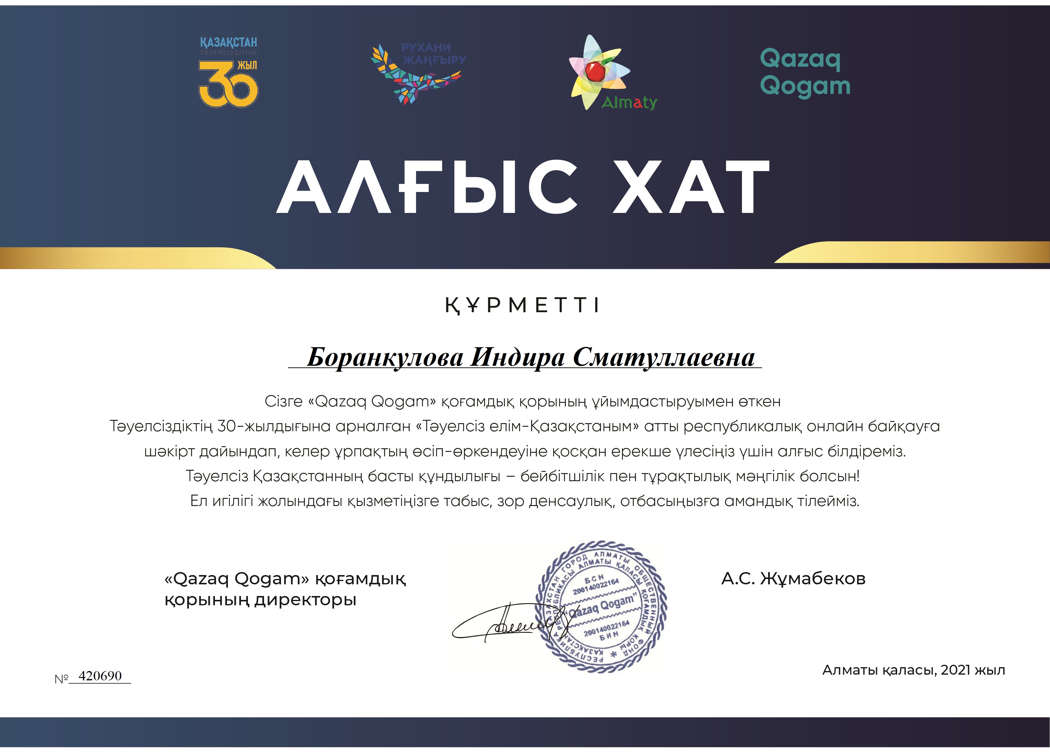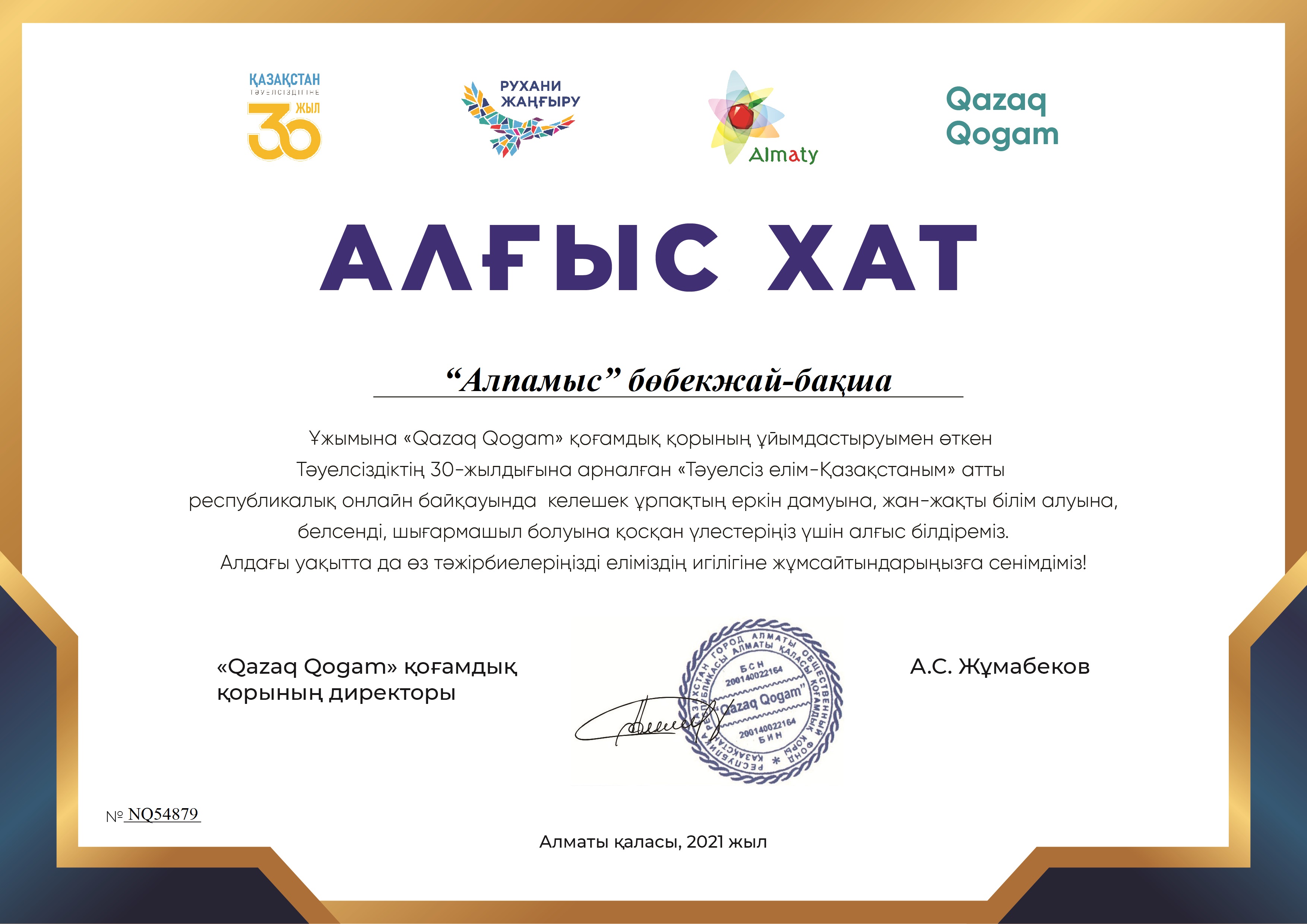 Алпамыс бөбекжай бақшасы "Qazaq qogam" қоғамдық қорының ұйымдастыруымен өткен Тәуелсіздіктің 30 жылдығына арналғ "Тәуелсіз елім - мақтанышым"ан атты республикалық байқауына түрлі номинациялармен балабақшадан барлығы 55 тәрбиеленуші қатысып. Түрлі жүлделерге ие болды.